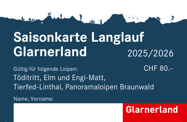 Gültig auf den Loipen: Schwanden-Linthal (Töditritt) - Engi/Matt - Elm - Panoramaloiope Braunwald. Nach der Bezahlung wird Ihnen der Langlaufpass innert 3-5 Tagen zugestellt. Weniger
